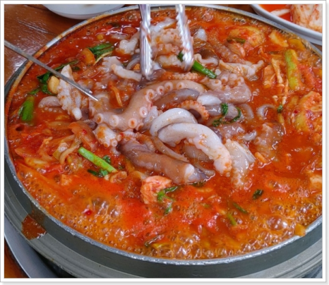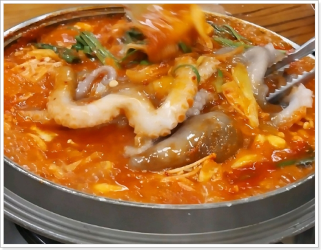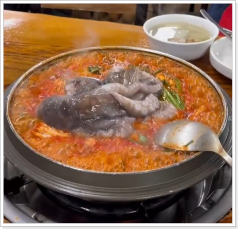 이 식당의 가장 큰 자랑은 바로 '싱싱한 낙지'입니다. 매일 아침 사장님이 직접 바다로 나가 신선한 낙지를 공수해 온다고 합니다. 일반 낙지보다 크기가 훨씬 크고, 쫄깃한 식감이 살아 있어 전골의 맛을 한층 업그레이드해줍니다. 문어만큼 크다 해도 과언이 아닌 낙지가 듬뿍 들어간 전골은 보기만 해도 입맛을 자극합니다.