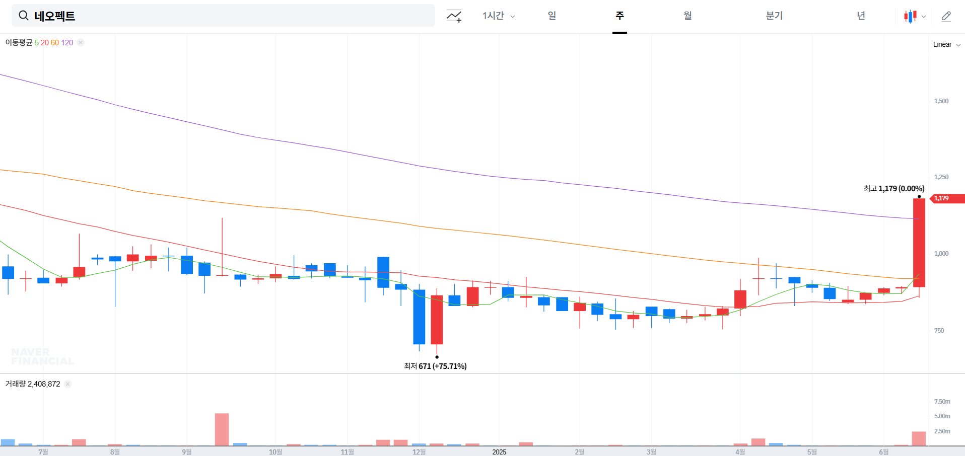 2025년 6월, 네오펙트가 장대 양봉과 함께 상한가(1,179원)를 기록하며
