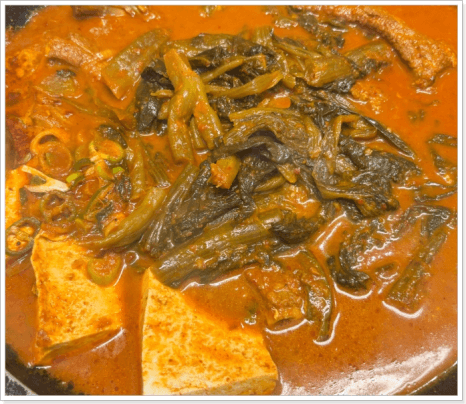 특유의 향긋하고 알싸한 풍미로 김치찌개의 깊이를 더해줍니다. 이 갓김치로 만든 찌개는 평범한 김치찌개와는 차별화된 맛을 자랑합니다.