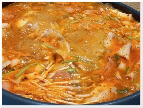 부대찌개는 햄, 소시지, 떡, 당면, 버섯, 간돼지고기 등 다양한 재료가 어우러져 깊은 맛을 내는 대표적인 국물요리입니다.