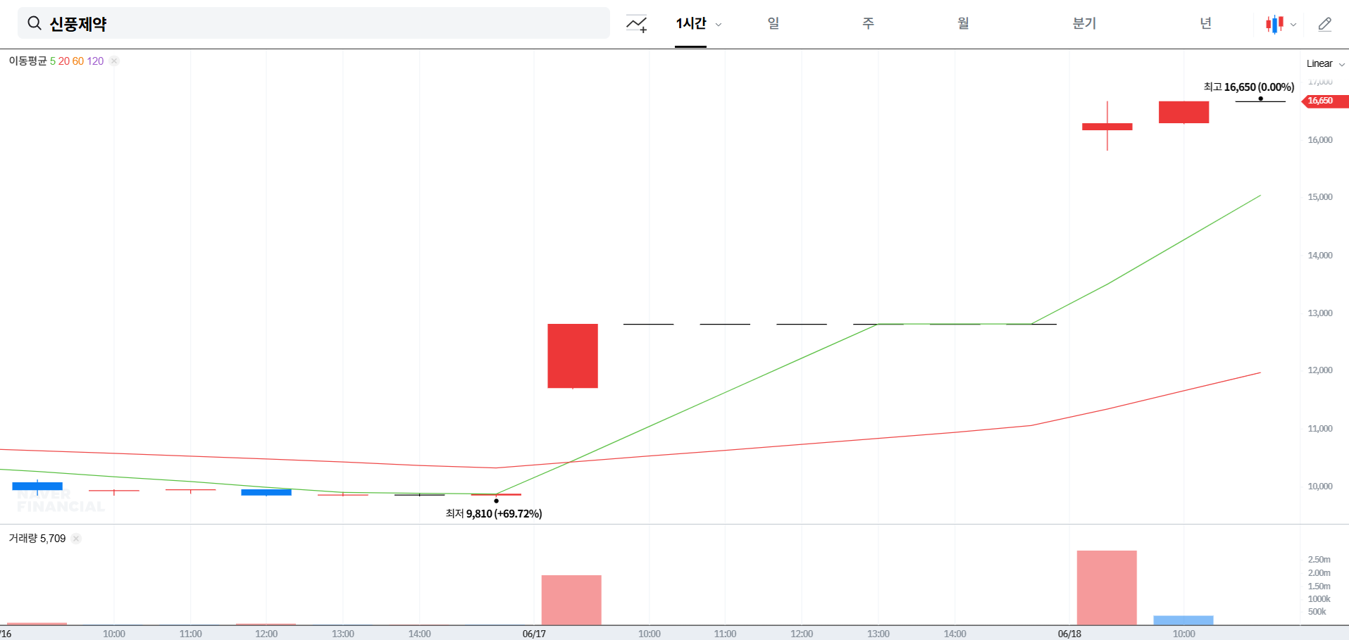 6월 18일, 신풍제약이 유럽 특허 승인 이슈로 상한가를 기록했습니다.