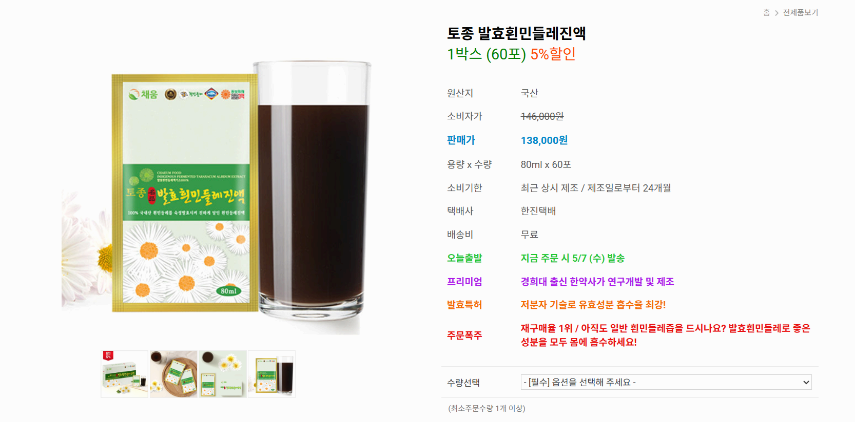 우선 사이트에서 내세우는 제품력은 타제품과 다르게 비교불가한 높은 함량을 지니고 있다고 말합니다. 발효 흰민들레 액기스 100%이고, 고형분 7% 이상이라고 합니다. 여기서 고형분이란 수분을 모두 날려 보냈을 때 남는 원료의 고체 형태 비율입니다. 즉, 고형분이 높을수록 함량이 높고 농도가 짙다고 합니다. 같은 양의 원료로도 높은 고형분 제품을 1박스 만들 수도 있고, 낮은 고형분 제품 10박스를 만들 수도 있기 때문에 고형분 %를 꼭 확인하는 것이 좋다고 합니다. 뿐만 아니라 경희대 출신 한약사가 연구개발 및 제조했고, 저분자 기술로 유효성분 흡수율이 최강이라고 합니다. 일반 흰민들레즙이 아닌 발효흰민들레즙이라는 점도 타제품과의 차이점입니다.