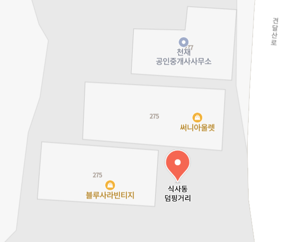 - 차량 이용 시: 견달산로에서 식사동 중심가 진입 후 ‘덤핑거리’ 표지판 또는 네이버/카카오 식사동 구제거리 검색