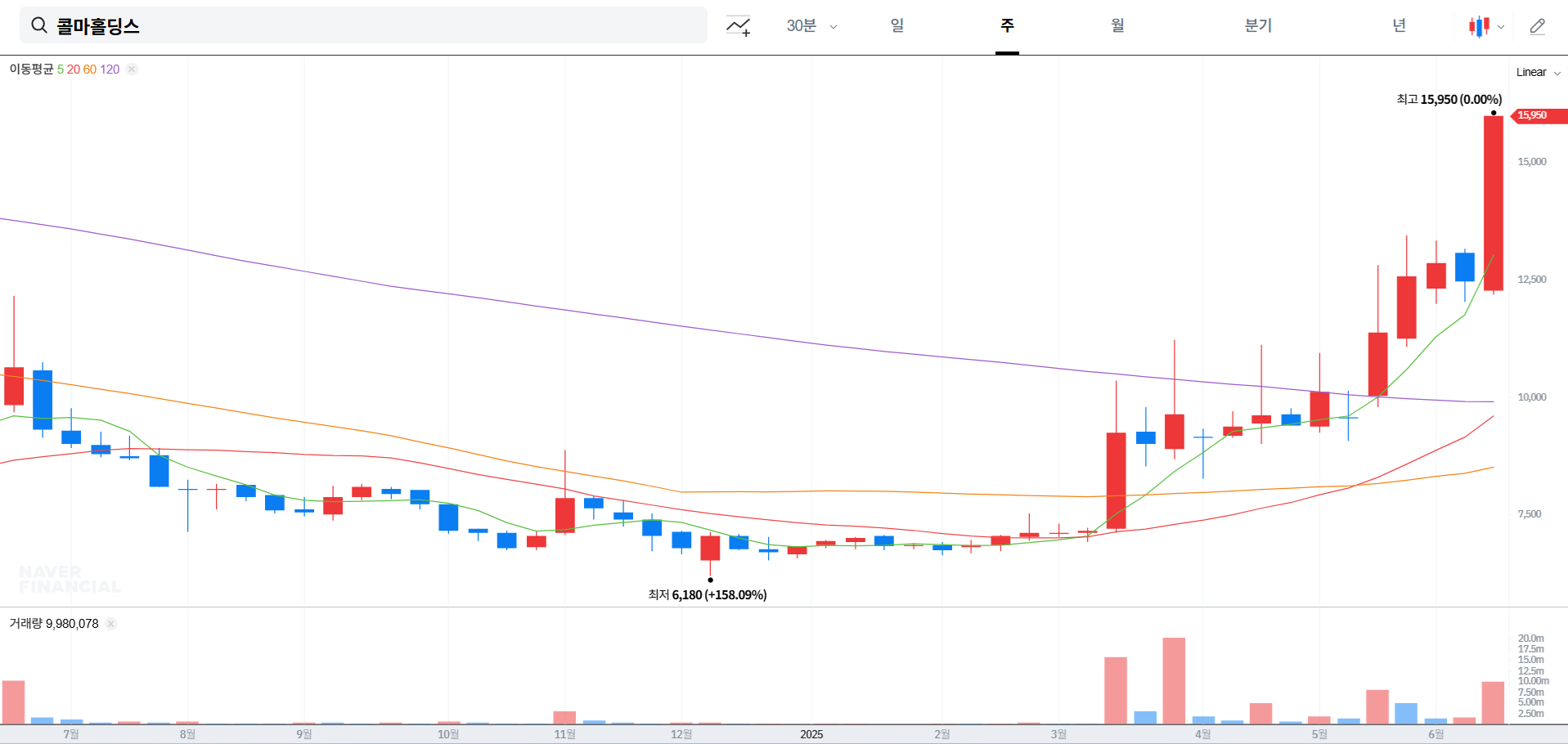 - 최저점 6,180원 (2024년 12월) → 최고 15,950원 (2025년 6월)