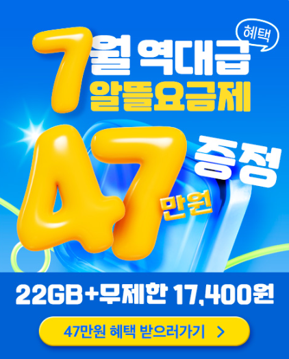7월 한정, 통신비 절약과 최대 47만원 혜택을 동시에 받을 수 있는 LG헬로비전 유심 요금제 이벤트가 시작됐습니다! 알뜰폰 찾는 분이라면 절대 놓치지 마세요. 특히 셀프개통으로 더 간편하게, 더 저렴하게 혜택까지 챙길 절호의 기회입니다.