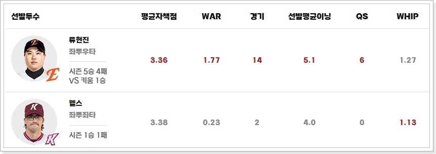 웰스는 시즌 중 영입된 대체 외국인 선수로, 아직 8이닝밖에 소화하지 않았지만 1승 1패 평균자책점 3.38로 준수한 성적을 거두고 있습니다. 두 선수 모두 좌완 투수라는 점에서 이번 경기 역시 치열한 투수전이 예상됩니다.