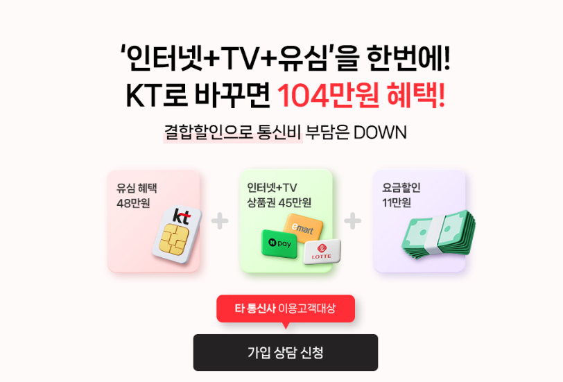 인터넷+TV 동시 가입 시 최대 45만원 상품권과 추가 요금할인 혜택까지 제공되니 절대 놓치지 마세요. 천만 고객이 선택한 KT의 특별한 혜택을 확인해보세요!