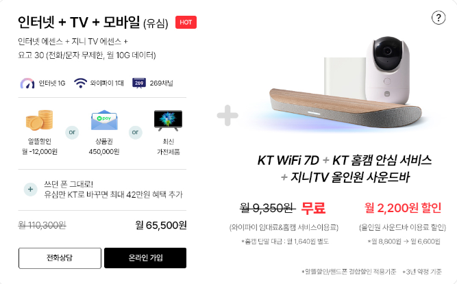 전화상담 없이 간편 가입도 가능하며, 지니TV 탭3, 최신형 WiFi 공유기, KT 홈캠까지 고급형 부가서비스가 기본 포함됩니다.